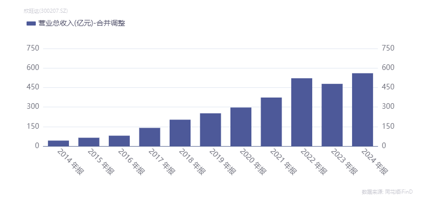 2014年至2024年,欣旺达营收一路从42.79亿元增长至560.21亿元。